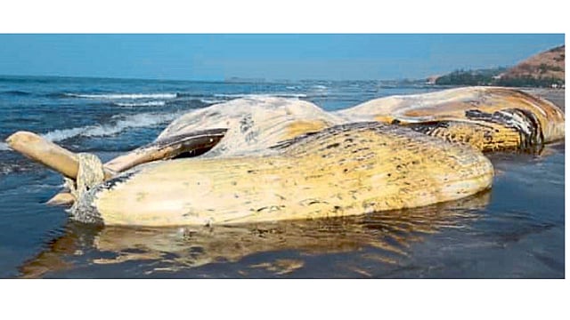 हर्णै रत्नागिरी : दापोली तालुक्यातील सालदूरे मुरुड समुद्रकिनारी बुधवारी (ता. २२) सकाळी ग्रामस्थांना ब्लू व्हेल जातीचा मासा मृतावस्थेत आढळून आला.