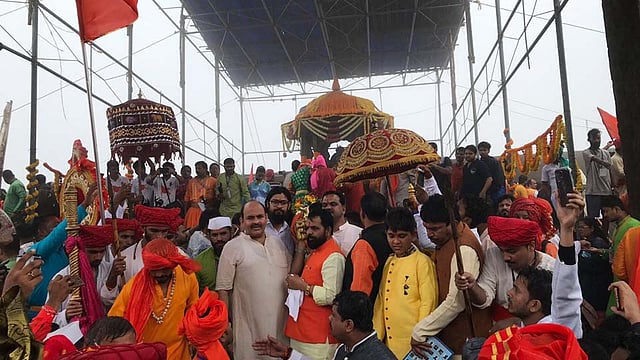 सूर्योदयाच्या वेळीचे अल्हादायक वातरवरण आणि शिवप्रेमींमधील अलोट उत्साह यामुळे रायगडावर वेगळेच उल्हासित वातावरण निर्माण झाले होते. रायगडावर पडणारा पाऊस आणि दाट धुक्याने दाटलेल्या किल्ले रायगडच्या मंगलमय वातावरणात सकाळी सहा वाजता शिवराज्याभिषेकाच्या धार्मिक विधीना सुरूवात झाली. ब्रह्मवृंदाच्या मंत्रघोषात वेदउच्चारासोबत सकाळी सात वाजता छत्रपती शिवाजी महाराजांची प्रतिमा सिंहासनाधिष्टीत करण्यात आली. सिंहासनावर आरूढ झालेल्या महाराजांच्या प्रतिमेवर सुवर्ण नाण्यांचा अभिषेक करण्यात आला. हा क्षण उपस्थित शिवप्रेमींची उत्कंठा शिगेला नेउन ठेवणारा होता. शिवप्रतिमेची पालखी वाजत गाजत जगदिश्वर मंदिरापर्यंत नेण्यात आली.