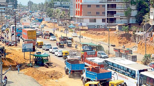 शहरात उड्डाणपुलाचे काम सुरू असल्याने महामार्गावरील तेलीआळी डीपी रोड ते नरडवे तिठा या दरम्यान सर्व्हिस रोड तयार करून वाहतूक सुरू केली आहे; मात्र हा सर्व्हिस रोड अरुंद आहे. त्यालगत वाहन पार्किंग होत असल्याने सतत वाहतूक कोंडी होत आहे. याखेरीज डीपी रोड येथे जंक्शन झाल्यानेही वाहने अडकून पडत आहेत.