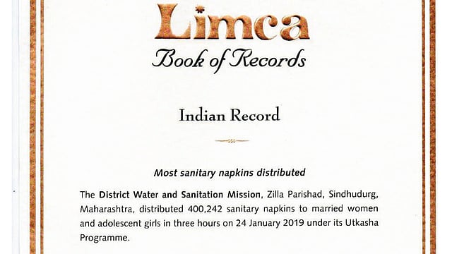 ओरोस ( सिंधुदुर्ग ) - जिल्हा परिषदेने 24 जानेवारी 2019 ला राबविलेल्या शासकीय सामुदायिक हळदीकुंकू कार्यक्रमाअंतर्गत अवघ्या तीन तासात 4 लाख 242 सॅनिटरी नॅपकीनचे वाटप केले होते. त्याची दखल घेत "लिम्का बुक ऑफ रेकॉर्ड'ने नोंद केली होती. त्याचे प्रमाणपत्र जिल्हा परिषदेला प्राप्त झाले आहे.