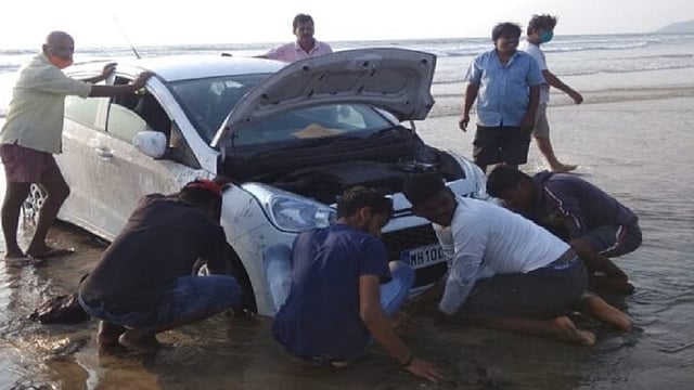 सांगली येथून गणपतीपुळे येथे चारचाकी वाहनातून पर्यटक आले होते. परिसर फिरण्यासाठी हे पर्यटक मालगुंड समुद्रकिनाऱ्यावर पोचले. या पर्यटकांनी किनाऱ्यावर वाळूत गाडी घालण्याचा प्रयत्न केला आणि बघता बघता गाडी वाळूत फसली. गाडी एक फुटापर्यंत वाळूत फसली आणि अखेर स्थानिकांनी प्रयत्न करून गाडी बाहेर काढली.