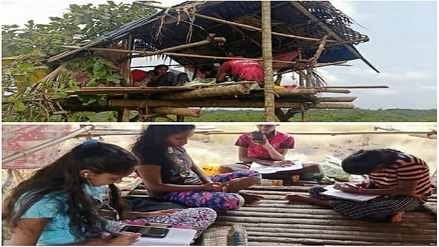राजापूर : दीर्घकाळ गायब असलेल्या मोबाईल रेंजसह इंटरनेट सेवेअभावी २१ व्या शतकातील डिजिटल युगामध्ये अनेक गावांमधील विद्यार्थ्यांचा ॲन्ड्रॉईड मोबाईल आणि टीव्ही सुविधा उपलब्ध असतानाही ऑनलाईन शिक्षण प्रणालीचा खेळखंडोबा झाला आहे. त्यावर मात करीत तालुक्यातील साखरकोंबे येथील विद्यार्थी उंच डोंगरावर पालकांनी बांधून दिलेल्या आणि इंटरनेटची पुरेशी रेंज असलेल्या निसर्गाच्या सान्निध्यातील माचाणावर गेल्या कित्येक महिन्यांपासून शिक्षणाचे धडे गिरवत आहेत.