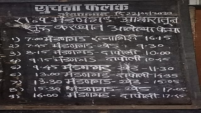 यात मंडणगड-रत्नागिरी सकाळी ७ वाजता, मंडणगड- खेड सकाळी ७:४५, मंडणगड-दापोली सकाळी ८:१५ वाजता, मंडणगड-दापोली सकाळी ९:१५ वाजता, मंडणगड-खेड सकाळी ९:४५ वाजता, मंडणगड-दापोली दुपारी १ वाजता, मंडणगड-खेड दुपारी १:३०, मंडणगड-खेड दुपारी ३:३०, मंडणगड-दापोली संध्याकाळी ४ वाजता या फेऱ्यांचा समावेश करण्यात आला आहे. आज ता.२३ मे रोजी रत्नागिरी, खेड व दापोली मार्गावर तीन गाड्या रवाना झाल्याची माहिती आगार व्यवस्थापक हनुमंत फडतरे यांनी दिली. मात्र तालुक्यातील ग्रामीण भागातील लाल परीचे दळणवळण अजूनही सुरू झाले नसल्याने तालुक्यात शांतता आहे.