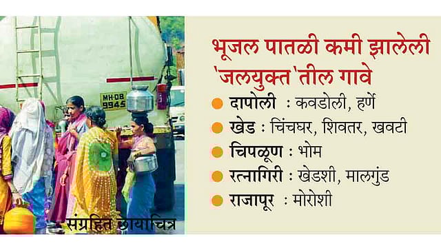 रत्नागिरी - भूजल पातळीत वाढ करून टंचाईतील वाड्यांना पाणी उपलब्ध करून देण्यासाठी जलयुक्त शिवार अभियान जिल्हाभर राबविण्यात येत आहे. या अभियानातील चोवीस गावांना अजूनही टॅंकरवरच अवलंबून राहावे लागत आहे. तसेच नऊ गावांमधील भूजल पातळीत मोठी घट झाल्याचे भूजल सर्वेक्षणाच्या अहवालातून स्पष्ट झाले आहे.