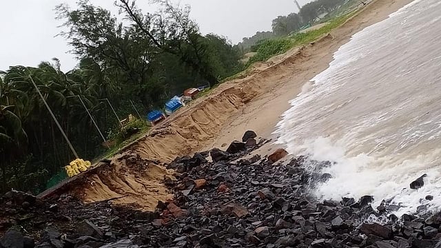 जिल्ह्यात आठवडाभर मुसळधार पाऊस कोसळत आहे. पावसाने पुरती दाणादाण उडवून दिली आहे. अनेक ठिकाणी पूरस्थिती आहे. समुद्रालाही उधाण असल्याने मोठ्या भरतीने पंधरामाड-कांबळेवाडी समुद्र किनाऱ्याची पुरती वाताहात झाली आहे. या भागातील जवळपास पंधरा फुटापेक्षा जास्त किनारा समुद्राने गिळंकृत केला आहे. यामुळे या पावसाळ्यात देखील मिऱ्यावासीयांची भीती कायम आहे. नुकत्याच झालेल्या अमावास्येनंतर आलेल्या उधाणाच्या लाटांमुळे कोकण किनारपट्टी भागात दाणादाण उडवून दिली. पुढील काही दिवस रत्नागिरी आजच्या उधाणाच्या लाटांचे तांडव किनारपट्टी भागात पाहायला मिळाले. आलावा-पाटीलवाडी, १५ माड परिसर, जयहिंद चौकामागील परिसरात उधाणाचे पाणी रहिवासी भागात शिरल्याने काही काळ भितीचे वातावरण होते.