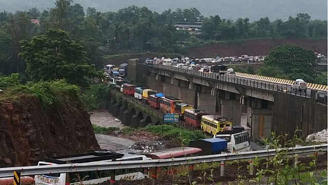 मुंबई-गोवा महामार्गावर पेन ते माणगाव दरम्यान झालेली वाहतूक कोंडी मोठी आहे. या वाहतूक कोंडीमुंळे पहाटे कोकणाकडे निघालेले चाकरमानी अडकून पडले आहेत.