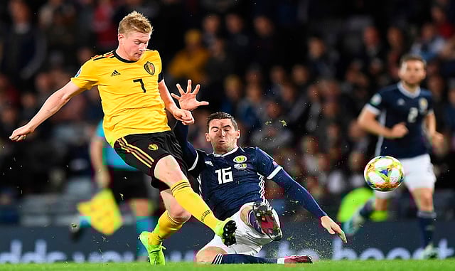बेल्जीयमचा मध्यरक्षक केविन डे ब्रूएन याला रोखण्याचा प्रयत्न करताना स्कॉटलंडचा मध्यरक्षक केनी मॅकलीन