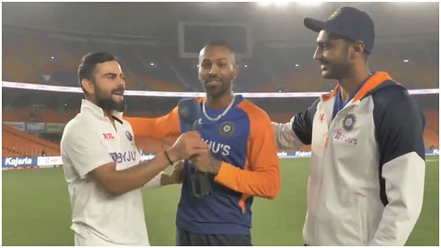 अहमदाबाद येथे खेळल्या गेलेल्या तिसऱ्या कसोटी सामन्यात टीम इंडियाने जबरदस्त कामगिरी केली आणि 10 विकेटने इंग्लंडचा पराभव करुन मालिकेत 2-1 अशी आघाडी घेण्यात यश मिळवले. तिसऱ्या कसोटी टीम इंडियाच्या फिरकीपटूंनी कमालीची गोलंदाजी केली. विशेषतः अक्षर पटेलने सामन्यात 11 विकेट घेतल्या. अक्षर पटेलला मॅन ऑफ द मॅच पुरस्काराने सन्मानित करण्यात आले. सामन्यानंतर हार्दिक पांड्या अक्षर पटेलची मुलाखत घेत होता. त्याचवेळी मध्येच कर्णधार विराट कोहली आला आणि माइक घेऊन गुजरातीमध्ये अक्षरचे कौतुक केले. कोहलीने माइक घेऊन ए बापू थारी बोलिंग कमाल छे, असे म्हटले.