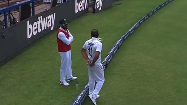 कोहलीची उणीव जाणवणाऱ्या चाहत्यांसाठी सामन्यादम्यान कोहलीची कमालीची झलक दिसली. भारतीय संघाच्या बॅटिंगवेळी ड्रेसिंग रुममध्ये बसेलेला कोहली फिल्डिंगवेळी चक्क सीमाषेवर येऊन संघातील खेळाडूंना इनपूट देताना दिसला. शमीसोबतचा त्याच्या जो व्हिडिओ व्हायरल होतोय त्यात कोहली फिल्ड प्लेसमेंटवरुन काहीतरी चर्चा करताना दिसते. त्याचा हा अंदाज चाहत्यांना चांगलाच भावताना दिसतोय.