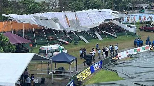 श्रीलंका आणि ऑस्ट्रेलिया यांच्यात गाले येथील आंतरराष्ट्रीय स्टेडियमवर पहिला कसोटी सामना खेळला जात आहे. सामन्याच्या पहिल्या दिवशीचा खेळ चांगला झाला. मात्र दुसऱ्या दिवसाचा खेळ सुरू होण्यापूर्वी पाऊस आणि वादळी वाऱ्याने चांगलाच कहर केला. गाले येथे खराब हवामानामुळे सामना वेळेवर सुरू झाला नाही. श्रीलंकेतील वादळ आणि पावसाचा जोर इतका होता की स्टेडियमच एक स्टँड कोसळलं. सुदैवाने ही घटना घडली तेव्हा स्टँडमध्ये कोणीही उपस्थित नसल्याने मोठी दुर्घटना टळली. (aus vs sl stand collapses storm watch video)