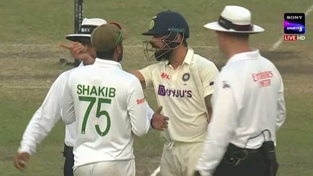 विराट पॅव्हेलियनकडे जाता जाता थांबला. यानंतर बांगलादेशचा कर्णधार शाकिब अल हसन आणि पंत विराटजवळ आहे. त्यानंतर विराटला शांत करून त्यांनी त्याची पाठवणी केली. मात्र जाता जात विराटने आपल्या आक्रमक शैलीत स्लेजिंग केले. विराट कोहलीचे या दौऱ्यावर अनेकवेळा बांगलादेशी क्रिकेटपटूंसोबत मैदानावर खटके उडले आहेत. विराट बांगलादेश फलंदाजी करत असताना टाईमपास करणाऱ्या शांतोला उद्येशून देखील काहीतरी म्हणाला होता.
