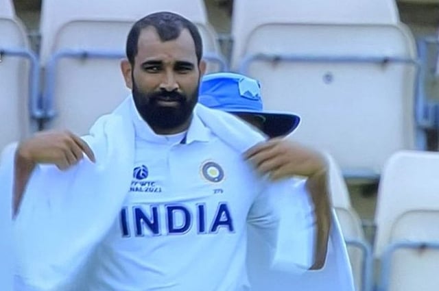 साउदम्टनच्या मैदानात टेस्ट जर्सी आणि लोअरवर टॉवेल गुंडाळून शमी फिल्डिंग करताना पहायला मिळाले. सोशल मीडियावर शमीच्या या अवतारातील फोटो व्हायरल होत आहेत. साउदम्टनच्या मैदानातील थंड वातावरणामुळे शमी टॉवेल गुंडाळून फिल्डिंग करताना दिसला होता. ब्रेकमध्ये तो तसाच ड्रेसिंगरुमच्या दिशेने येतानाही पाहायला मिळाले. विराट कोहलीने त्याच्याकडून सातत्याने गोलंदाजी करुन घेतली. त्यामुळे अंगाला येणार घाम आणि त्यावर होणारा थंडीचा मारा यामुळे शमीने टॉवेलचा आधार घेतल्याचे दिसले.