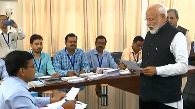 वाराणसी : पंतप्रधान नरेंद्र मोदी यांनी आज (ता. 26) आपला लोकसभा निवडणूकीसाठीचा उमेदवारी अर्ज निवडणूक अधिकाऱ्यांकडे दाखल केला. यावेळी त्यांनी प्रतिज्ञापत्राचे वाचन केले. यावेळी वाराणसीतील जुने कार्यकर्ते सुभाष गुप्ता यांनी प्रास्तावक म्हणून तर अन्नपूर्णा शुक्ला आणि जगदीश चौधरी अनुमोदक म्हणून भूमिका बजावली.