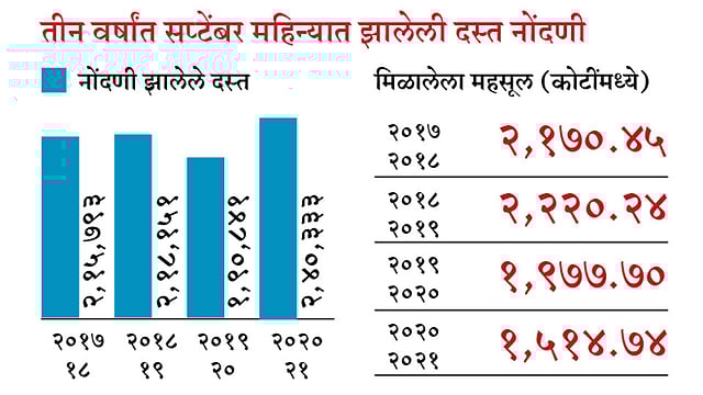 कोरोना आणि आर्थिक मंदी यामुळे बांधकाम व्यवसायात मरगळ आली होती. त्याला चालना देण्यासाठी राज्य सरकारने डिसेंबर अखेरपर्यंत तीन टक्के मुद्रांक शुल्कात सवलत देण्याचा निर्णय घेतला. या निर्णयाची अंमलबजावणी सप्टेंबरपासून राज्यात सुरू झाली. विशेष म्हणजे २४ सप्टेंबरपर्यंत राज्यात १ लाख ५६ हजार ८६६ दस्त नोंदणी झाली होती. त्यातून सरकारला ८३६ कोटी ३१ लाख रूपये महसूल मिळाला होता. त्यांनतर सहा दिवसांत म्हणजे ३० सप्टेंबरपर्यंत एकूण दस्तांची संख्या २ लाख ४० हजार ३३३ वर गेली. या सहा दिवसांत तब्बल ८३ हजार ४६७ दस्तांची नोंद झाली. त्यातून ६७८ कोटी ४३ लाख रूपयांचा महसूल सरकारला मिळाला.