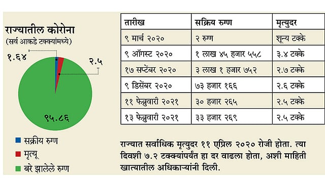 कोरोनाची लक्षणे असलेल्या एक कोटी 52 लाख 72 हजार 826 रुग्णांची तपासणी राज्यात करण्यात आली आहे. सरकारी तसेच, खासगी प्रयोगशाळांचे मोठे जाळे त्यासाठी उभारण्यात आले. त्यातून गेल्या अकरा महिन्यांमध्ये 13.5 टक्के (20 लाख 60 हजार 186) रुग्णांना कोरोना झाल्याचे निदान झाले. उर्वरित 86.6 टक्के (एक कोटी 32 लाख 12 हजार 640) रुग्णांना कोरोना नसल्याचे प्रयोगशाळा अहवालातून स्पष्ट झाले. राज्यात सध्या कोरोनाच्या 33 हजार 269 रुग्णांवर उपचार सुरू आहेत. त्यापैकी 5 हजार 633 रुग्ण पुणे जिल्ह्यातील आहेत.