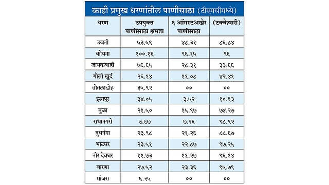 राज्यातील अमरावती, औरंगाबाद, कोकण, नागपूर, नाशिक आणि नागपूर या विभागात एकूण १४१ मोठे प्रकल्प आहेत. तर, २५८ मध्यम आणि दोन हजार ८६८ लघू पाटबंधारे प्रकल्प आहेत. या सर्व धरणांची एकूण प्रकल्पीय उपयुक्त पाणीसाठा क्षमता ४०८९७.९५ दशलक्ष घनमीटर म्हणजेच एक हजार ४४४ अब्ज घनफूट (टीएमसी) आहे. त्यापैकी सध्या २१ हजार दशलक्ष घनमीटर म्हणजेच ७४१.९० टीएमसी एवढा पाणीसाठा उपलब्ध आहे. ३१ जुलै रोजी एकूण उपयुक्त पाणीसाठा ५२६ टीएमसी होता.