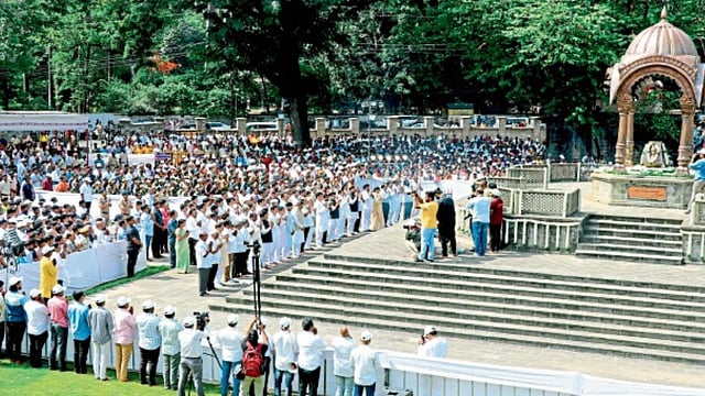 प्रमुख मान्यवरांचे साडेनऊच्या सुमारास आगमन झाले आणि साऱ्यांच्या नजरा हातातील घड्याळांवर खिळल्या. बरोबर नऊ वाजून ५९ मिनिटांनी सारी मंडळी आहे त्या ठिकाणी उभी राहिली आणि बरोबर दहा वाजता सारा परिसर स्तब्ध झाला. शंभर सेकंदाच्या अभिवादनानंतर पुन्हा ‘राजर्षी शाहू महाराज की जय'' असा जयघोष सुरू राहिला. श्रीमंत शाहू छत्रपती महाराज, महसूलमंत्री बाळासाहेब थोरात, ग्रामविकास मंत्री हसन मुश्रीफ, उच्च व तंत्रशिक्षण मंत्री उदय सामंत, पालकमंत्री सतेज पाटील, खासदार संभाजीराजे छत्रपती, ‘सकाळ’माध्यम समूहाचे संपादक संचालक श्रीराम पवार, मालोजीराजे छत्रपती, मधुरिमाराजे छत्रपती, शहाजीराजे छत्रपती, यशस्विनीराजे छत्रपती, यशराजराजे छत्रपती, खासदार संजय मंडलिक, खासदार धैर्यशील माने, ज्येष्ठ इतिहास संशोधक डॉ. जयसिंगराव पवार यांच्यासह जिल्ह्यातील लोकप्रतिनिधी, विविध पक्ष, संस्थांचे पदाधिकारी यावेळी उपस्थित होते.