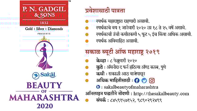तरुणींच्या गुणवत्तेला संधी देण्यासाठी, सर्वगुण संपन्न व्यक्तिमत्त्व घडवण्यासाठी ‘सकाळ माध्यम समूहा’तर्फे ‘सकाळ ब्यूटी ऑफ महाराष्ट्र २०२०’ ही स्पर्धा घेण्यात येणार आहे. स्पर्धेचे हे तिसरे वर्ष असून ‘पु. ना. गाडगीळ आणि सन्स’ या स्पर्धेचे मुख्य प्रायोजक आहेत. या स्पर्धेच्या निमित्ताने राज्यातील शहरी तसेच ग्रामीण भागातील दर्जेदार गुणवत्ता समोर येणार आहे. केवळ सौंदर्यालाच नव्हे; तर तरुणींमधल्या कलागुणांना प्रकाशकोंदण मिळणार असून, त्यांच्या सर्वांगीण विकासाचा हेतूही या स्पर्धेतून साध्य होणार आहे. या स्पर्धेविषयी अपडेट्स मिळविण्यासाठी तरुणींनी फेसबुक, इन्स्टाग्राम, ट्विटरवर फॉलो करावे.