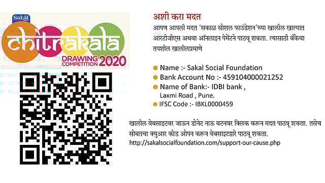 पाच हजार रुपयांची आर्थिक मदत देऊन एका गरजू किंवा दिव्यांग विद्यार्थ्याला ‘सकाळ-चित्रकला स्पर्धा २०२०’मध्ये सहभागी होण्यासाठी प्रोत्साहन द्या. या उपक्रमासाठी समाजातील दानशूर व्यक्ती, स्वयंसेवी संस्था, खासगी कंपनी, आस्थापना व सीएसआर कंपन्या यांना ‘सकाळ सोशल फाउंडेशन’च्या वतीने आर्थिक मदत करण्याचे आवाहन करण्यात येत आहे. ‘सकाळ सोशल फाउंडेशन’ संस्थेला दिलेली आर्थिक मदत ही प्राप्तिकर कायद्याच्या ८०-जी कलमानुसार सवलतीस पात्र आहे.