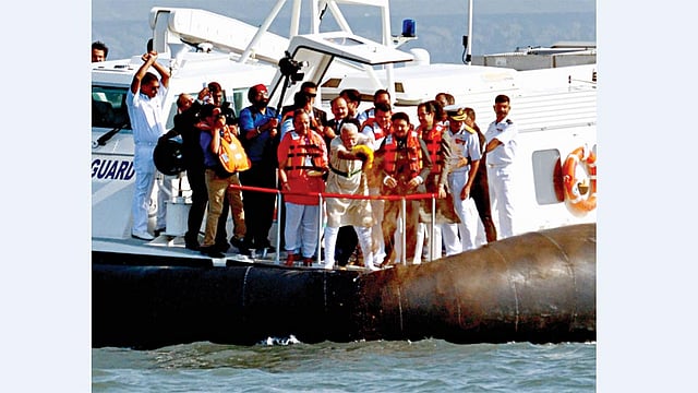 मुंबई - महाराष्ट्रभरातील नद्यांचे जल आणि गड-किल्ल्यांवरील मातीचे शनिवारी समुद्रार्पण करताना पंतप्रधान नरेंद्र मोदी.