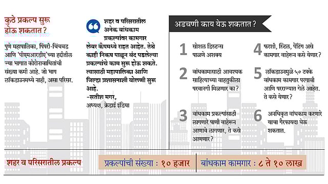 पुणे - पुरेशी काळजी घेऊन पुणे शहरात व परिसरात बंद पडलेले बांधकाम प्रकल्प सुरू होऊ शकतात. बहुसंख्य बांधकाम कामगार साइटवरील लेबर कॅंपमध्ये अडकून पडले आहेत. त्यामुळे कोरोनाचे ‘हॉटस्पॉट’ सोडले, तर अन्य भागात हे शक्य असून, यासंदर्भात महापालिका आणि जिल्हा प्रशासन मार्ग काढेल, अशी अपेक्षा बांधकाम व्यावसायिक व्यक्त करीत आहेत.