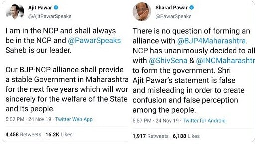 "राष्ट्रवादी'मधून बंडाळी केल्यानंतर अजित पवार यांनी कालपासून मौन धारण केले होते. पंतप्रधान नरेंद्र मोदी यांनी काल अजित पवार यांना ट्विटरवरून दिलेल्या शुभेच्छांना अजित पवार यांनी आज धन्यवाद मानल्यानंतर त्यांच्यावर भाजपच्या केंद्रीय मंत्री आणि नेत्यांचा शुभेच्छांचा वर्षाव झाला. त्यानंतर अजित पवार यांनी राष्ट्रवादी कॉंग्रेसच्या कार्यकर्त्यांना ट्विटरवरून संबोधत "मी राष्ट्रवादी कॉंग्रेसमध्येच असून, कायम शरद पवार साहेबांच्या नेतृत्वाखालीच असणार आहे. आपले भाजप आणि राष्ट्रवादीचे आघाडीचे सरकार पुढील पाच वर्षे महाराष्ट्राला स्थिर सरकार देईल,' असे सांगितले. यामुळे एकच संभ्रम निर्माण झाला. त्यामुळे अर्ध्या तासाच्या आत शरद पवार यांनी अजित पवार यांनी केलेल्या वक्तव्याशी आणि भाजपशी काहीच संबंध नसल्याचे स्पष्ट केले.