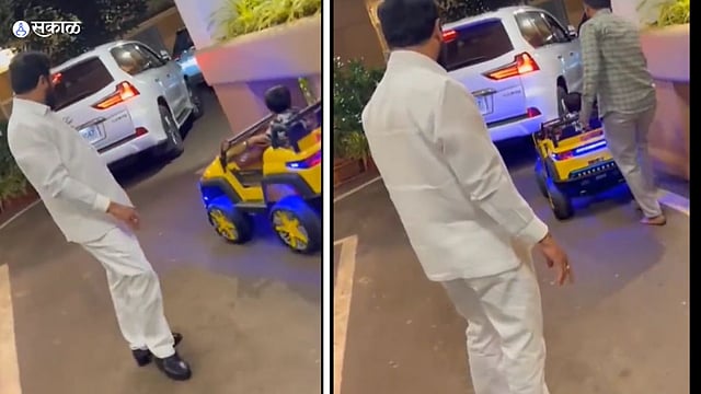 या व्हायरल व्हिडीओमध्ये मुख्यमंत्री शिंदे आपला नातू रुद्रांशसोबत खेळताना दिसत आहेत. रुद्रांश खेळण्यातली छोटी गाडी चालवत आहे आणि शिंदे त्याच्या मागे पळताना, त्याच्यावर लक्ष ठेवताना दिसत आहेत.