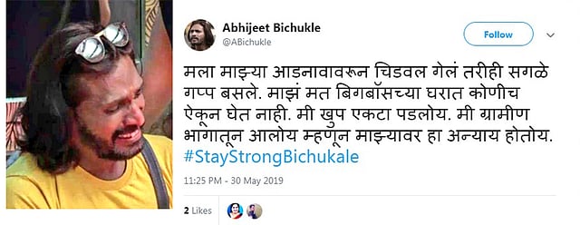 बिग बॉस मराठीच्या नव्या पर्वाला नुकतीच सुरुवात झाली आहे. स्पर्धकांमध्ये साताऱ्यातील अभिजीत बिचुकले हे आहेत. त्यांचे व्यक्तीमत्व बहुआयामी आहे. ते कवी मनाचे आहेत. राजकारणात सक्रिय आहेत. साताऱ्यातील कोणत्या ही चौकात ते उभे राहून आपली मते ठामपणे युवकांच्या मनावर बिंबविण्याचा प्रयत्न करतात. राष्ट्रपतीपदाची निवडणुकही लढविण्याची इच्छा त्यांनी माध्यमांसमोर व्यक्त केली होती. असे हे साताऱ्याचे बिचुकले सध्या बिग बॉस मराठीत आपली चुणुक दाखवित आहेत. विशेष म्हणजे मालिका सुरु झाल्यापासून बिचुकले चर्चेत आहेत. स्पर्धकांच्या एका ग्रुपचे नेतृत्व त्यांच्याकडे सोपविण्यात आले आहे. बिचुकलेंची व्यक्तव्य अन्य स्पर्धकांना बोचू लागली आहेत. बिग बॉसच्या घरातील सदस्यांशी त्यांचे खटके उडू लागले आहेत. त्यांच्याशी कोणी ही जुळवून घेत नसल्याचे त्यांनी स्वतः ट्विट करुन व्यक्त केले आहे. माझ्या आडनावावरून चिडवल गेलं तरीही सगळे गप्प बसले. माझं मत बिग बॉसच्या घरात कोणीच ऐकून घेत नाही. मी खुप एकटा पडलोय. मी ग्रामीण भागातून आलोय म्हणून माझ्यावर हा अन्याय होतोय अशी भावना त्यांनी व्यक्त केली आहे. यामध्ये #StayStrongBichukale हा हॅशटॅग देखील त्यांनी वापरला आहे. त्यांच्या ट्विटला रसिकांनी प्रतिसाद देत आम्ही तुमच्या पाठीशी आहोत असे पाठबळ दिले आहे. महेश माने याने बिचुकले विनर असेल, सागर माने याने बिचुकले आगे बढो हम तुम्हारे साथ है अशी भावना व्यक्त केली आहे. विशाल पवारने घरात फक्त किशोरी सूज्ञ आहे जी बिचुकलेला टॅकेल करु शकते बाकी सगळे त्याच्या नादी लागणारे मुर्ख आहेत असे संबोधिले आहे. भाऊंना नेहमीच सपोर्ट असणार तेच बिग बॉस ठरणार असे बिचुकलेंच्या छायाचित्रांसह सोशल मिडीयावर धूम उठली आहे.