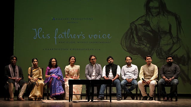 मुंबई : बारा वर्षांपूर्वी विभक्त झालेल्या वडील आणि मुलाचं हळुवार नातं उलगतं. बासरी आणि गिटार यांच्या अनोख्या फ्युजनची अनुभूती मिळते. मनाचा ठाव घेणाऱ्या नृत्य व संगीताची अनोखी मैफल पहायला मिळते. अश्विनी प्रतापराव पवार निर्मित व कार्तिकेयन किरूभाकरन दिग्दर्शित 'हिज फादर्स व्हॉईस' या चित्रपटाचा देखणा आणि भव्य प्रिमियर गुरुवारी (ता. 6) पार पडला. या प्रिमियर सोहळ्याला अनेक मान्यवर मंडळी उपस्थित होती.