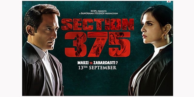 'सेक्शन 375' ह्या आगामी चित्रपटाचा ट्रेलर नुकताच रीलिझ करण्यात आला. पॅनोरामा स्टुडिओने निर्मित ह्या चित्रपटाचे दिगदर्शन अजय बहलने केले आहे. या सिनेमामध्ये अक्षय खन्ना, रिचा चड्डा, मीरा चोपरा, राहूल भट हे कलाकार आहेत. हा सिनेमा 13 सपटेंबरला रीलिझ होणार आहे.