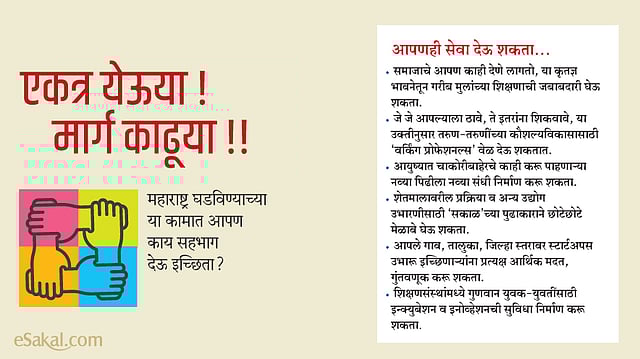 पुणे : शिक्षण-नोकरी व शेती क्षेत्रातील विविधांगी समस्या आणि त्यामुळे महाराष्ट्रात निर्माण झालेल्या सामाजिक अस्वस्थतेच्या पार्श्वभूमीवर, ऐरणीवर आलेले प्रश्न समाजाच्याच मदतीने सोडविण्यासाठी 'सकाळ माध्यम समूहा'ने पुढाकार घेतला असून, कौशल्यविकास, कृषिप्रक्रिया, त्यातून उद्योजकतेला चालना आणि युवक-महिलांच्या उत्थानासाठी समाजातील सेवाभावी व्यक्ती व संस्थांनी पुढे येण्याचे आवाहन करण्यात आले आहे.