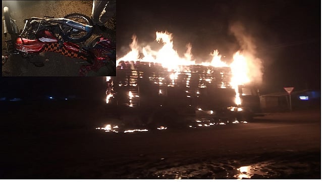 आडुळ (औरंगाबाद) : भरधाव आयशर ने दुचाकीला धडक दिल्याने दुचाकीस्वार जागीच ठार झाला. यानंतर संतप्त जमावाने दुचाकीला उडविणारया आयशर ला औरंगाबाद-सोलापुर राष्ट्रीय महामार्गावरील दाभरुळ फाटा (ता.पैठण) येथे आडवुन आयशर पेटवुन दिला. घटनेची माहिती मिळाल्यानंतर पाचोड पोलिसांनी घटनास्थळी धाव घेवून आयशरला लागलेली आग विजविण्याचा पर्यंत केला. मात्र त्यांना यश आले नाही. यानंतर अग्निशामक दलाने आग आटोक्यात आणली.