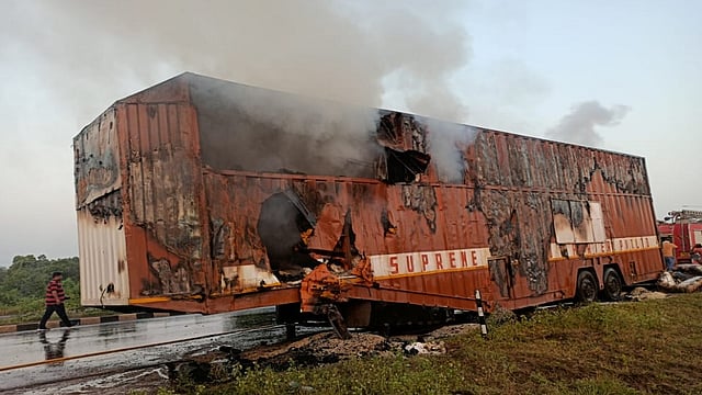 पाचोड (जि.औरंगाबाद) : औरंगाबादहून (Aurangabad) भरधाव वेगात मुरमुरे घेऊन बीडकडे (Beed) जाणाऱ्या कंटेनरने अचानक पेट घेतला. यात कंटेनरसह मुरमुरे जळून खाक झाल्याची घटना बुधवारी (ता१३) पहाटे दीड वाजेच्या सुमारास औरंगाबाद- सोलापूर राष्ट्रीय महामार्गावरील आडगाव जावळे (ता.पैठण) (Paithan) जवळ घडली असुन सुदैवाने यात कोणतीही जीवितहानी झाली नाही. अधिक माहिती अशी, औरंगाबादहून मुरमुरे घेऊन कंटेनर भरधाव वेगात बीडकडे जात असताना बुधवारी (ता.१३) पहाटे औरंगाबाद-सोलापूर राष्ट्रीय महामार्गावरील आडगाव (जावळे) जवळ अचानक त्याने पेट घेतला. कंटेनरमधून आगीचे लोण उठत असल्याचे चालकाला आरशात दिसताच चालकाने प्रंसगावधान राखत तातडीने बाहेर उडी घेत सोबतच्या क्लिनरला झोपेतून उठवत त्याला बाहेर पडण्यास सांगितले व कंटेनर मुख्य रस्त्याच्या बाजूला घेऊन चालकाने पाचोड पोलिसांसह अग्निशामक दलाला मोबाईलवरून माहीती दिली.