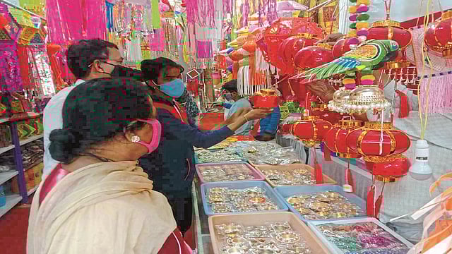 औरंगाबाद : अवघ्या दोन-तीन दिवसांवर आलेल्या दिवाळीच्या सणाच्या खरेदीसाठी बाजारात मोठी गर्दी दिसून येत आहे. गेल्या सहा महिन्यांपासून लॉकडाऊनमुळे बंद असलेली बाजारपेठ दसऱ्यापासून पूर्वपदावर आली आहे. आता दिवाळीसाठी साहित्य खरेदीची लगबग सुरू आहे. गेल्या वर्षीप्रमाणे यंदाही बाजारपेठेने मोठी उसळी घेतल्याचे सध्याचे चित्र आहे. सोमवारी (ता.९) आकाशदिवे, पणत्या, लायटिंग, लक्ष्मीपूजनासाठी देवीच्या मूर्ती व साहित्यासह कपडे खरेदीसाठी दुकानात मोठी गर्दी दिसून आली.