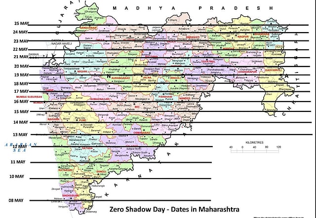 महाराष्ट्रातील कोल्हापूर जिल्ह्यात १५.६ अक्षांश ते धुळे जिल्यात २१.९८ अक्षांश या दरम्यान शून्य सावली दिवस पाहता येणार आहे. महाराष्ट्रातील सर्व शहरे आणि गावांच्या वेळात काही सेकंदांचा फरक आहे. त्यामुळे दुपारी १२.१५ ते १२.३० या वेळा दरम्यान सूर्य निरीक्षण करावे. एमजीएम एपीजे अब्दुल कलाम खगोल अंतराळ विज्ञान केंद्राचे संचालक श्रीनिवास औंधकर यांनी म्हटले आहे.