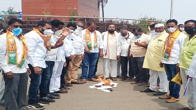 शेतकऱ्यांसाठी एक देश एक बाजारपेठ असणार आहे. आपला शेतमाल कुठेही आणि योग्य भावात विकण्याचे स्वातंत्र्य मिळणार आहे. या कृषी सुधारणा विधेयकामुळे शेतकऱ्यांना खऱ्या अर्थाने स्वातंत्र्य प्राप्त होणार आहे. परंतु नेहमीच शेतकऱ्यांबद्दल खोटे प्रेम दाखवून शेतकऱ्यांना देशोधडीला लावणाऱ्या महाविकास आघाडी सरकारने शेतकऱ्यांचे स्वातंत्र्य हिरवणारा स्थगिती आदेश काढला आहे. या स्थगिती आदेशाची होळी अंबड शहरातील पाचोड नाक्यावरील छत्रपती शिवाजी महाराज पुतळ्याजवळ आघाडी सरकारच्या आणि सहकार, पणनमंत्री बाळासाहेब पाटील यांच्या निषेधार्थ घोषणा देऊन निषेध आंदोलन करण्यात आले.