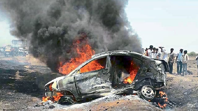 परभणी येथे एका खासगी व्यवस्थापनात अभियंता असलेले ज्ञानेश्वर जाधव हे विवाहसाठी पुण्याला गेले होते. पत्नी मनीषा, मुलगी लावण्यासह ते कारने परभणीत परतत होते. सकाळी साडेअकराच्या सुमारास महामार्गावरील कोळगावजवळील (ता. गेवराई) सूर्यमंदिरासमोर त्यांच्या कारला जीपने धडक दिली. याच वेळी काजळा येथील ज्ञानेश्वर साबळे हा दुचाकीवरून जात असताना तोही या जीपला धडकला. या वेळी जाधव यांची कार व दुचाकीनेही पेट घेतला. कारचे दरवाजे बंद असल्याने कोणालाच बाहेर पडता येत नव्हते. कोळगाव येथील ग्रामस्थांनी ज्ञानेश्वर जाधव, मुलगी लावण्याला कारची समोरील काच फोडून बाहेर काढले. तोपर्यंत गर्भवती मनीषा जाधव पूर्ण भाजल्या आणि त्यांचा जागीच मृत्यू झाला. ज्ञानेश्वर जाधव, लावण्याला बीड जिल्हा रुग्णालयात दाखल केले; मात्र उपचारादरम्यान लावण्याचा मृत्यू झाला. कारला धडक देणाऱ्या जीपमधील सर्व तरुण मद्यधुंद असल्याचे ग्रामस्थांनी सांगितले. जीपमध्ये दारूच्या बाटल्याही आढळल्या. पेटलेल्या कारमधील लोकांना वाचविण्याऐवजी हे सर्वजण पसार झाले.