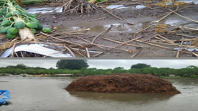 उदगीर (जि.लातूर) : तालुक्यात गेल्या दोन दिवसांपासून सुरू असलेल्या वादळी वाऱ्यासह पावसामुळे व काही मंडळात अतिवृष्टी झाल्याने सोयाबीन, ऊस व फळबागांचे अतोनात नुकसान झाले आहे. त्यामुळे शेतकऱ्यांचे कंबरडे मोडले आहे. हवामान विभागाने दिलेल्या अंदाजानुसार मंगळवारी (ता.१३) रात्रीपासून पावसाला सुरवात झाली. यात अधूनमधून आलेल्या वादळाने व सततच्या पावसाने काढून ठेवलेल्या सोयाबीन पिकांचे प्रचंड नुकसान झाले आहे. सोयाबीनची काढणी झाल्यानंतर गोळा करून ठेवलेल्या सोयाबीनच्या काडावर झाकलेल्या ताडपत्र्या उडाल्याने सोयाबीन भिजून मोठ्या प्रमाणावर नुकसान झाले आहे.