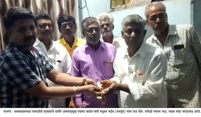 आगारप्रमुख दयानंद पाटील यांनी मधुकर नाईक यांच्याशी संपर्क साधला. या वेळी श्री. नाईक यांनी आपले दागिने हरवले असल्याचे म्हटले. त्यावर श्री. पाटील यांनी मंगळवारी सायंकाळी उपस्थितांसमक्ष दोन लाख रुपये किमतीचे दागिने मधुकर नाईक यांना परत केले.