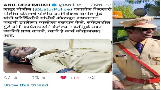 औसा (जि.लातूर) : दुचाकीवरून पडलेल्या व गंभीर जखमी झालेल्या व्यक्तीला आपले रक्त देऊन त्याला वाचविण्याचा प्रयत्न करणाऱ्या किल्लारी (ता. औसा) येथील पोलिस उपनिरीक्षक अमोल गुंडे यांच्या मानवतेच्या भावनेतून केलेल्या कामाची खुद्द राज्याचे गृहमंत्री अनिल देशमुख यांनी ट्विट करून दखल घेत त्याचे कौतुक केले आहे. अमोल गुंडे यांच्या खाकीआड लपलेला एक संवेदनशील आणि सामाजिक भान असलेला अधिकारी आज संबंध लातूर जिल्ह्याला दिसला.