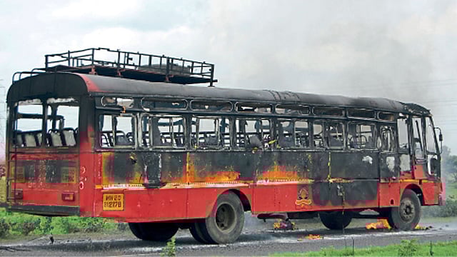 नांदेडहून देगलूरकडे निघालेली एसटी बस (एमएच- २०, बीएल- २१७८) नांदेड-हैदराबाद महामार्गावरील येळी (ता. लोहा) फाट्याजवळ आज दुपारी एकच्या सुमारास २५ ते २५ जणांनी दगडफेक करीत अडविली. प्रवाशांना खाली उतरविले. त्यानंतर जमावाने बसमध्ये रॉकेल ओतून ती पेटवून दिली आणि घोषणा देत संबंधित वेगवेगळ्या दुचाकींवरून पसार झाले.