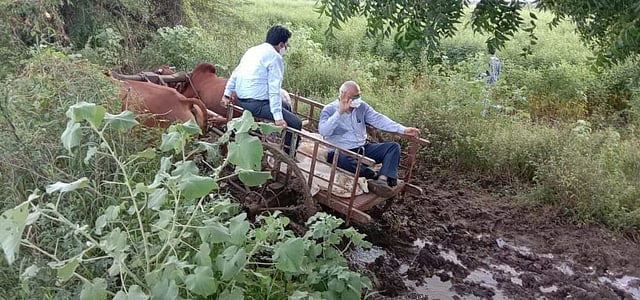 पालम ः गेल्या आठ दिवसांपासून जिल्ह्यात पावसाचा जोर वाढला आहे. त्यामुळे जिल्ह्यातील अनेक भागात पावसाने हाहाकार उडविला असून शेतीचे मोठ्या प्रमाणात नुकसान झाले आहे. पालम तालुक्यात अनेक गावात नुकसानीचा आकडा मोठा आहे. सलग दोन दिवसांपासून गंगाखेड विधानसभा मतदाससंघाचे आमदार रत्नाकर गुट्टे यांनी या तालुक्यात दौरा केला. रविवारी (ता.२७) त्यांनी जिल्हाधिकारी दीपक मुगळीकरांना सोबत घेवून नुकसानग्रस्त भागाची पाहणी केली. या वेळी रस्ता नसल्याने वाहन जात नसल्याने आमदार रत्नाकर गुट्टे यांनी बैलगाडी मागवून घेतली. या वेळी बैलगाडीत आमदार रत्नाकर गुट्टे यांच्यासह जिल्हाधिकारी मुगळीकरांनी देखील बसून शेताच्या बांधावर जात पाहणी केली.