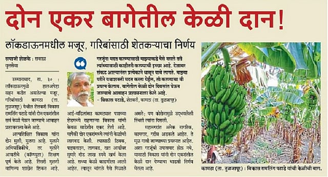 कोरोणा विषाणूचा संसर्ग रोखण्यासाठी प्रत्येक पातळीवर शर्थीचे प्रयत्न केले जात आहेत. अनेक सामाजिक संघटना, उद्योजक, सिनेकलाकार आपल्या परिने या लढ्यात स्वतःचे योगदान देत आहेत. कोणी आर्थिक तर कोणी वस्तुंच्या स्वरुपात मदत करून लढ्याला बळकटी देण्याचा प्रयत्न करीत आहेत. तुळजापूर तालुक्यातील विकास रामलिंग पटाडे यांनी त्यांच्या दोन एकर बागेतील केळी लॅकडाऊनमध्ये अडकलेल्या शेतकऱ्यांसाठी दिली आहे.