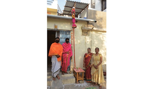 परभणी : ‘कोरोना’च्या सावटाखाली बुधवारी (ता.२५) गुढी पाडव्याचा सण साजरा करण्यात आला असून मास्क लावून गुढ्या उभारण्यात आल्या आहेत. नेहमी सारखा कोणताही उत्साह वा आनंद यावेळी दिसुन आला नाही.भितीदायक वातावरणात गुढी पाडवा साजरा केला जात आहे.