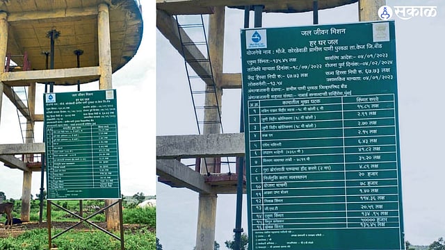 कोरडेवाडी येथे जल जीवन योजनेअंतर्गत करण्यात आलेली कामे अपूर्ण आहेत. सद्यस्थितीत गावातील नळांना पाणी आले नसताना संबंधित कंत्राटदाराने चार फेब्रुवारी २०२४ रोजी काम पूर्ण झाल्याचा फलक पाण्याच्या टाकीजवळ लावला. त्या फलकावर झालेली कामे व त्यासाठी झालेला खर्च नोंदवण्यात आला आहे.