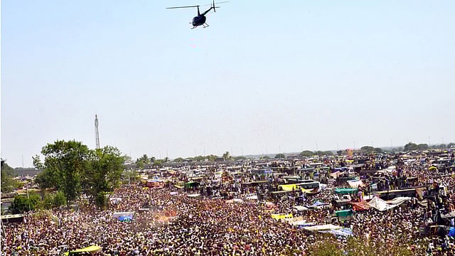येरमाळा : येथील येडेश्वरी देवीच्या यात्रेत रविवारी (ता. एक) आई राजा उदो उदोच्या जयघोषात लाखो भाविकांनी चुनखडीच्या रानात पालखी दाखल झाल्यानंर चुनखडी वेचली. यावेळी देवीच्या पालखीवर हेलिकॉप्टरमधून पुष्पवृष्टी करण्यात आली.