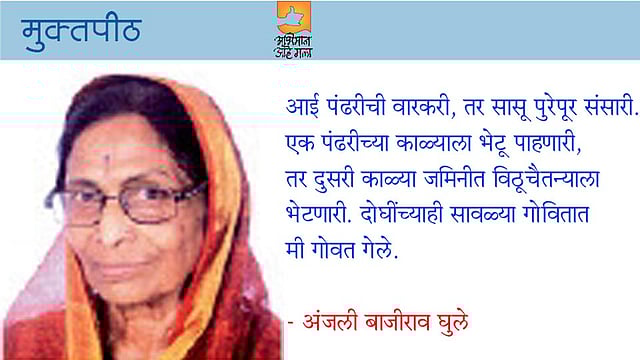 आई पंढरीची वारकरी, तर सासू पुरेपूर संसारी. एक पंढरीच्या काळ्याला भेटू पाहणारी, तर दुसरी काळ्या जमिनीत विठूचैतन्याला भेटणारी. दोघींच्याही सावळ्या गोवितात मी गोवत गेले.