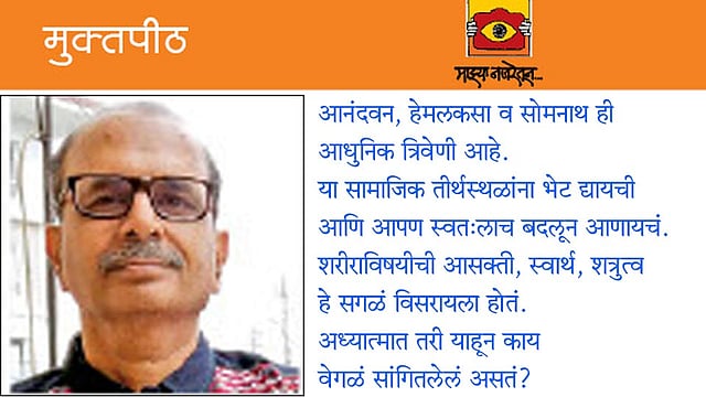 आनंदवन, हेमलकसा व सोमनाथ ही आधुनिक त्रिवेणी आहे. या सामाजिक तीर्थस्थळांना भेट द्यायची आणि आपण स्वतःलाच बदलून आणायचं. शरीराविषयीची आसक्ती, स्वार्थ, शत्रुत्व हे सगळं विसरायला होतं. अध्यात्मात तरी याहून काय वेगळं सांगितलेलं असतं?
