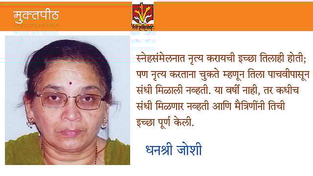 डिसेंबर महिन्यात शाळा-शाळांमधून एक नवचैतन्याची लहर निर्माण होते. वार्षिक स्नेहसंमेलनाची गडबड सुरू होते. चौदा विद्या, चौसष्ठ कलांचे संमेलन, प्रदर्शन, कला, क्रीडा स्पर्धा, वर्गावर्गांचे कार्यक्रम, आनंदमेळा, अल्पोपाहार अशा अनेक कार्यक्रमांनी संमेलन बहारदार ठरते. या काळात विद्यार्थिनींमधील अनेक सुप्तगुण, कला लक्षात येतात आणि कळत न कळत अध्यापक व विद्यार्थिनी यांच्यात वेगळे जवळकीचे नाते निर्माण होते. अभ्यास, पेपर, वह्या या सगळ्यांतून जरा बाहेर पडून मिळणारा आनंद दर वर्षी नवीन उत्साह निर्माण करणारा असतो. नेहमी प्रमाणेच याही वर्षी स्नेहसंमेलनासाठी वर्गावर्गाच्या ‘डान्स’चे विषय सांगितले गेले आणि विद्यार्थिनींमध्ये एकच चर्चा सुरू झाली, गाणे कोणते निवडायचे? कोणाकोणाला घ्यायचे? डान्ससाठी मुली निवडणे हे मोठे कठीण काम, कारण प्रत्येकीलाच सहभाग घ्यायचा असतो, या वेळी खरी कसोटी असते ती वर्गशिक्षिकेची! अशीच एक घटना मनात कायमचे घर करून राहिलेली.