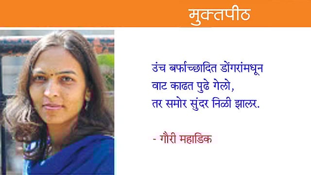 उंच बर्फाच्छादित डोंगरांमधून वाट काढत पुढे गेलो, तर समोर सुंदर निळी झालर.
